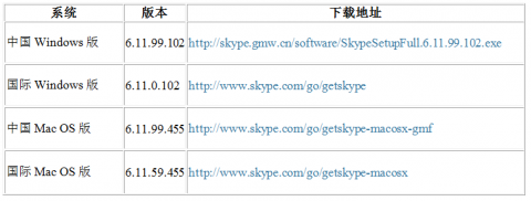 Great Fire在下表列出了Skype的下载地址。“gmw”是微软在中国合作伙伴的名称。版本“6.11.99.455”是一个特殊的中国版本。