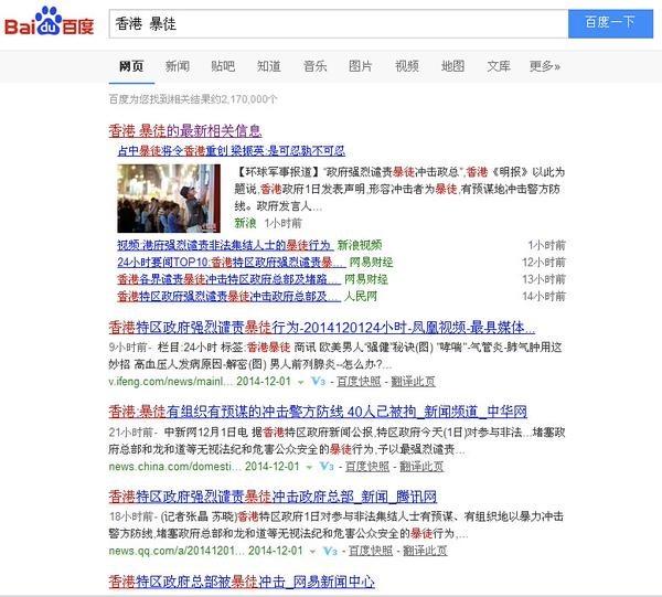同时,在大陆各网络平台上可见五毛大批出动,污蔑抨击占中抗争的言论随处可见。有网友发现,关键字“香港警察”在微博上被禁止搜索,但搜索关键字“香港暴徒”无论用微博还是百度,都可见大量内容。