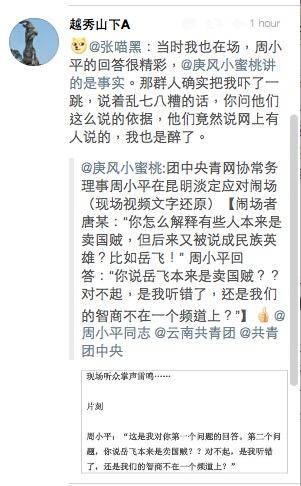 据描述,当时周小平怔了一下,继而说:”扯不清“。几个团委干部随即将周小平拥在中间,保护其匆匆离场。