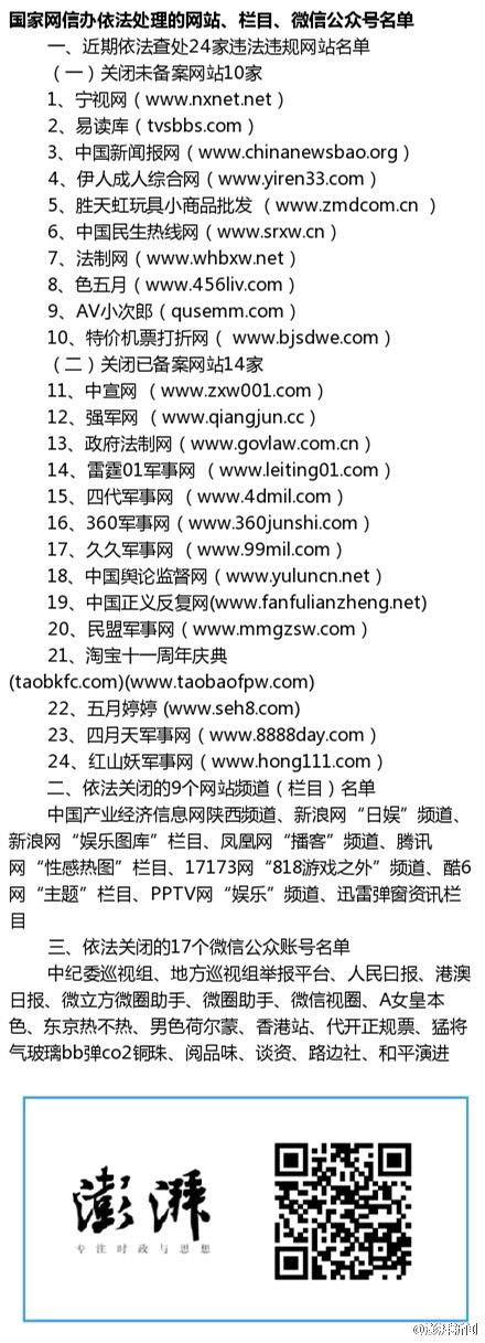 网信办在1月13号召开新闻发布会 ,公布了近期被依法关闭的一批网站、栏目和微信公众账号。据了解,共有50家网站、频道(栏目)以及微信公众账号被依法关闭,包括24家网站、9个网站频道(栏目)和17个微信公众号,其中包括中国新闻报网、法制网、中宣网、强军网等,9个网站频道涉及中国重要的门户网站新浪网的"日娱频道"、腾讯网的"性感热图"栏目、凤凰网"播客"、迅雷弹窗资讯栏目等。时评人莫之许评论称:“看了一下国信办关闭的网站、频道,微信公众号名单,比较有意思的是关了一大堆的军事网站,这可是铁血粪青的集中营,看来民族主义也要国有化啊”。