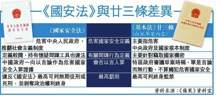 此举掀起评论界反对声颇高,认为破坏了香港高度自治权,更忧虑中央有意全面向香港开战,打压香港自由。如图中显示,《国安法》相比二十三条,维护北京权益的针对性意图更为明显,打击范围更广,罪罚更重。