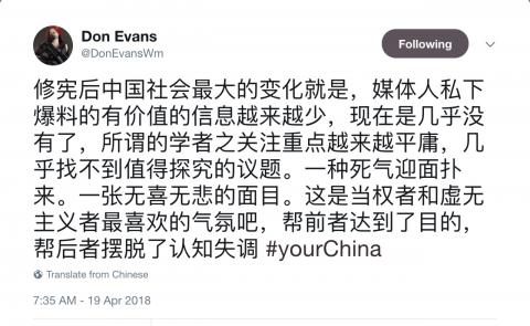这个政权在人们心目中的印象已经变成了撒旦,这不仅仅是意识到了它的邪恶,更有畏惧它的力量。风靡中国异议群体的 “冰河时代” 论 就是其最典型的体现。当权者每公布一款新的管制措施,都会给虚无主义者们增添一份心安理得。