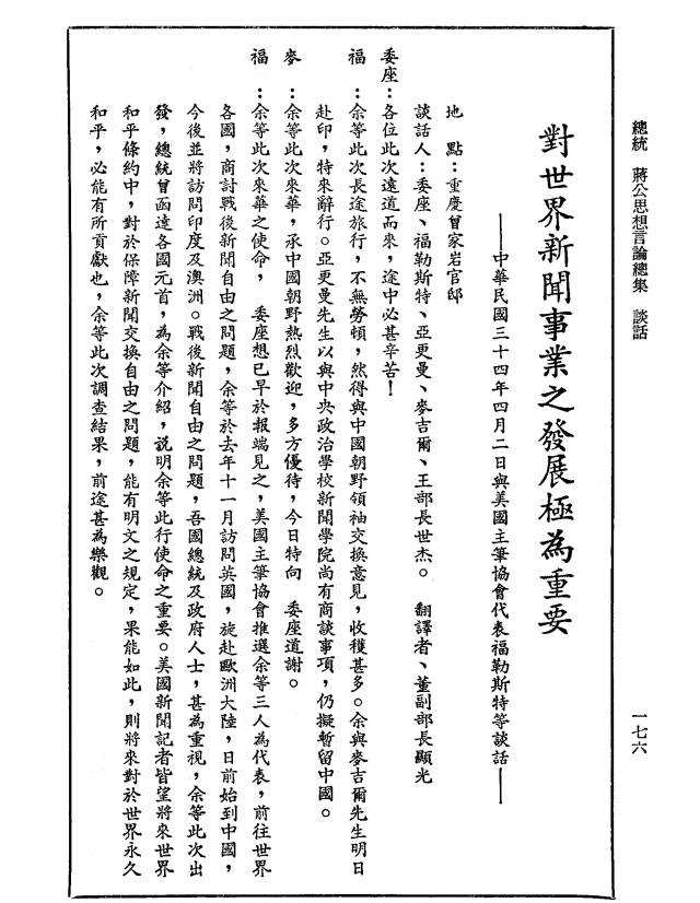 (《總統蔣公思想言論總集》中關於蔣介石接見美國新聞界代表團的記錄)
