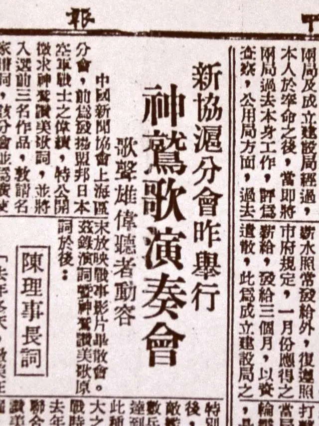 一九四五年三月五日下午五時,上海外灘華懋飯店(今和平飯店)賓客熙攘。鎂光燈前,那位 「倀傳媒」 (指六十年前抗日時期淪陷區的報紙)《申報》總編輯陳彬龢出現了。他宣佈,「去年冬天,敵美在太平洋蠢動以來,盟邦陸軍航空部隊,以一人一機一艦主義,組織神風特別攻擊隊」,鑒於此種神風精神,有宣傳廣大之必要,有在後方各種工作上推動之必要,去年十二月特公開徵求「神鷲讚美歌詞」,應徵者非常踴躍……當天舉行的,正是應徵歌曲的音樂會。