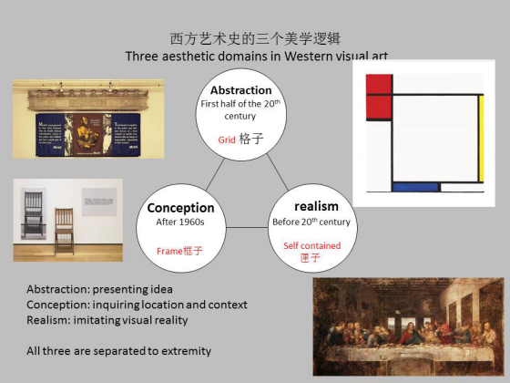 18 世纪“再现”出现以后深刻影响了西方艺术史的发展,在艺术史理论和实践方面都发生了深远影响。所以我在这里选取了匣子、格子和框子指向三种不同类型的艺术理论,三个不同的艺术创作时期和三种不同的艺术分类。匣子在前, 19 世纪末之前。格子紧接着,在 20 世纪上半期,格子就是现代的。最后是框子, 60 年代以后的当代。
