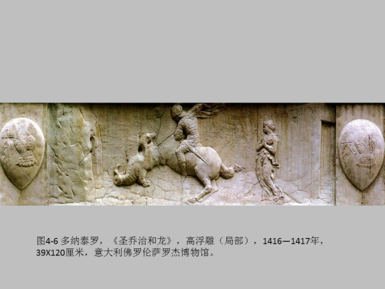 这个是希腊古典时期的《赫及所纪念碑》,我们看这个浮雕的时候不要盯着人看,而是看情节和层次:它有三个层次,一是高光,二是阴影,三是背板,某种程度上讲,这三个层次构成了一定的抽象性,特别是这两个人只是镶嵌在背板上,它是介于平和深之间的。所以,李格尔认为这是从触觉到视觉之间的一个中间性的转折阶段。到了罗马时期,比如这个浮雕,多纳泰罗的《圣乔治和龙》,边上有回廊建筑,空间内有近有远,有虚有实,这就是焦点透视的“视觉”阶段。它是自足的,所有物象都被装进了一个封闭的匣子。
