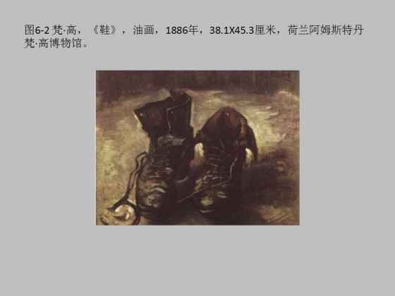 如果我们在看另外一个公案,就是海德格尔 1935 年写了一篇文章就是谈梵高的《鞋》,他谈关于物的这种思想,他认为梵高这双鞋不是一般的鞋,不是纯粹的物,它也不是完全有用的物,而是一个承载着某种真理自我显现,他有能力把自己存在性的真理显示出来,梵高就做了这么一个工作,海德格尔大谈鞋上怎么沾的泥土,穿的鞋是一个农妇,每天走在田间路上,当太阳升起,或者迎着冬天凛冽的寒风。他认为这双鞋承载着大地,即世界精神性的东西。特别有意思的是 33 年以后艺术史家夏皮罗说这个鞋是梵高自己的鞋,根本不是一个农妇的鞋,他就置疑海德格尔的理论过于主观。