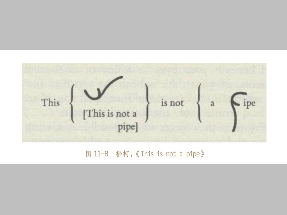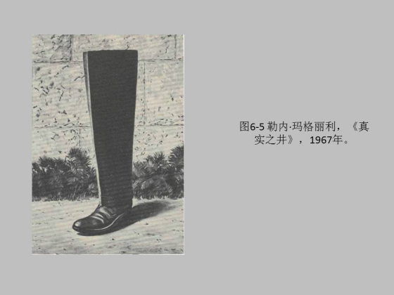 如果写实是模拟形象,到了抽象如何把语词形象化,到观念这个阶段即后现代以后主要强调语词的介入。按照福柯的说法, 17 世纪以前主要是模拟形象阶段,我们认识外在世界的知识叙述主要是把外在的对象形象进行比较,其实我们说模仿这个词不是针对某一个特定的形象的照搬,而是说我们在所有与它相关的形象当中进行比较和判断,只有这样的话我们才能把某一个形象模拟的更加真实。福柯认为这种模仿主要是以形象的比较作为基础,到了 17 世纪以后他认为知识叙事系统就进入了语词介入,这就是再现的开始,他举的例子就是委拉士贵之的《宫娥》这幅画。到了 20 世纪以后就是语词主导的话语系统和权力中心,语词话语更多的介入到我们的知识叙事系统里面,福柯举了超现实主义画家玛格丽特的绘画作为代表。所以说,这个二元钟摆模式表现了西方艺术史叙事的发展模式。