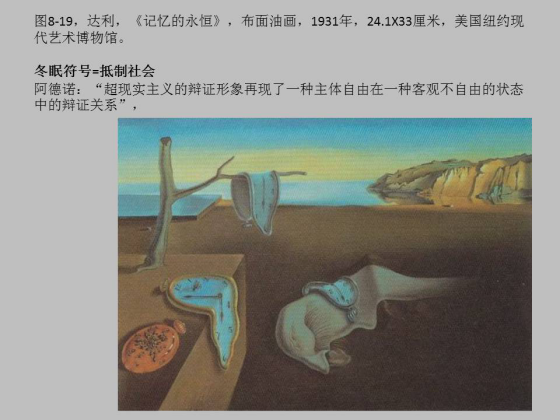 到了现代主义的艺术史和艺术批评那里,符号和媒介等同起来。不仅仅格林伯格的“绘画就是绘画自身”强调媒介的独立价值。同时,象新马克思主义者阿德诺, T J 克拉克等也把现代艺术作品看作媒介符号,克拉克认为印象派的绘画是社会阶级身份的经济符号。而阿德诺认为现代艺术的本质是资本主义社会中的“冬眠”。他说,从原始时期人就有私有财产的欲望,现代的社会有了资本有了科学,反而更加助长了这种私欲的发展,所以他认为艺术应当对资本主义社会持抵制态度,但艺术没有必要去批判,只要用冬眠的方式去抵制,这种纯艺术把艺术的表现力和自律性集大成地表现出来。超现实主义,又是写实的又不是现实,他认为超现实主义是一个矛盾的辩证形象,比如达利的作品,“再现”了一种主体自由,资本主义社会的知识分子都在追求一种主体自由,但是在资本泛滥的社会当中客观上又不自由。在这种状况当中出现了一种辨证关系,即不自由的自由。