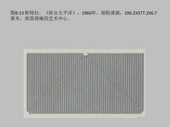 与欧洲的早期抽象绘画不同,波洛克为代表的抽象表现主义强调的是无意识的东西。波洛克被说成美国的英雄,因为波洛克的这种自动绘画被看作资本主义社会自由独立的知识分子的代言,相对于共产主义,它是一个自由主义的战士。另一个“去神话”的是极少主义。他们主张“你看到的是什么就是什么”(斯特拉 Stella )。看到的色域就是色域,这里没有乌托邦没有精神,斯特拉《联合太平洋》这幅画,画什么就是什么,跟着画布走,先在画布上方中央按照画布的底纹画一个小长方形,然后下方划一条直线,沿着这个小方形和直线重复地画线,直到画满,就是格子,这个格子就走到另外的极端。