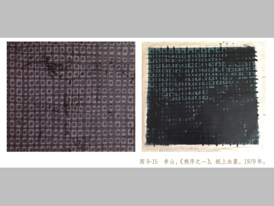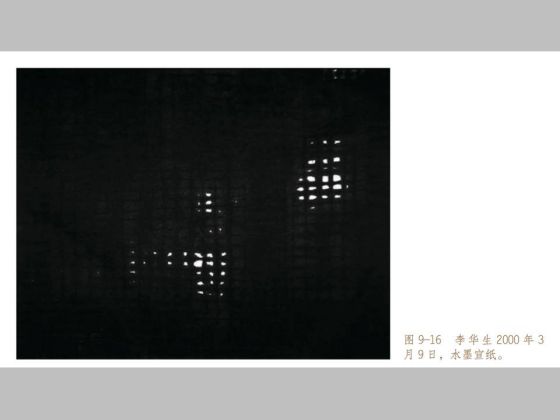 李华生也画格子,用水墨宣纸画格子。他在 2000 年左右呆在成都自己的老房子了画了一批这样的格子,他所在的那个地区都是当地的老宅,几百年的历史,要被拆迁。李和邻居抵制拆迁,但最后只有李华生成功了。他的房子被保留下来了。后来邻居因为各种原因都放弃了,被拆了。但他坚决不走,每天在家里画格子,李华生把格子看成自己的日记,记录着一段时间和自己的心路。