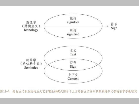 然而如此一来,就正式开启了当代艺术批评和艺术史研究中的文化政治语言学,它被命名为一个新的学科,叫做视觉文化。把艺术扩展为各种类型的视觉和传媒图像,这里的“文化”是指辐射到社会中每个角落的视觉景观,它不仅仅是指视觉艺术产品,同时包括产品的生产和传播系统。所以,对于后现代来,现代主义的批评是“再现的政治“。这是什么意思呢?比如说我要评价一个画家的艺术作品,除了对它的作品进行一定的点评以外,还要考虑到他的作品价值符合哪个美术馆喜欢的类型,它应该和哪个流派和哪一组批评家发生关系,要判断作品将来的出路和方向,等等,这是艺术批评的策略,也就是政治化的东西,但是,批评本身仍然围绕作品的本质性和类型化而展开,所以,这是“再现的政治“,这是批评的政治。到了后现代就不是了,它是一种“政治的再现”,体制批判和权力话语直接成为艺术的内容。在批评中,艺术品和艺术家都放在这个体制当中,放在这个生态当中去检验,政治体制和艺术风格不再是分开的。艺术批评和艺术史研究就是政治的再现,就是整个政治大环境的生态的“再现”。所以西方过去二三十年中出现的视觉文化研究已经打破了过去的客体研究。我们看到,20世纪上半期的符号再现和20世纪之前的象征再现还是停留在研究艺术作品自身的各种因素以及它们之间的关系的客体研究( object studies )。现在这种框子的再现观念和上下文转向试图把艺术史的研究、艺术批评和艺术理论的关注点转移到整个的艺术生产系统、认识艺术的知识系统和接受艺术的叙事传播系统中去。也就是,艺术理论的兴趣从本文转移到上下文,后结构主义反对结构主义语言学的静止和共时性的比较方法,试图把一个概念,或者一个图像看作一个语言链中无时无刻不在发生异变的语词,这个解构主义的语词观念不断颠覆结构主义的稳定静止的关系。所以,传统结构主义的能指和所指关系再后结构主义那里也发生了变化,能指被解放,被赋予更多的上下文可能性,另一方面,所指被敞开,面向更宽泛和多向的空间。 实际上后结构主义的符号学是对结构主义能指和所指一体两面相互制约的能指和所指关系的符号学的颠覆。要让能指自由化,所指变得更加宽泛,这就是我所说的“无边的再现“。在后结构主义那里,本文和上下文相互交叉的中间部分是符号。我在这里把图象学和结构主义和符号学与后结构主义的符号学进行了对比,它主要的还是二元论。