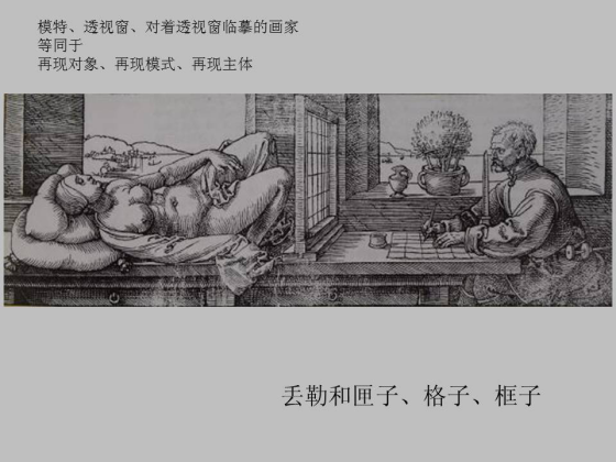 早期的艺术史家黑格尔以及后黑格尔的艺术史家,比如李格尔和沃尔夫林等在研究艺术史的时候是建立在封闭自足的匣子这个叙事模式的基础上的,其中原因是他们主要关注古典写实的艺术。这个很好理解,“匣子”,往里面看有深度有不同的层面,这个概念原来是来自于“窗子”的概念。平面的“格子”其实是“匣子”其中一个面,在这个平面之上去结构某种方块几何型,格子只是作为现代抽象艺术的的代表。 60 年代以后的这种框子,主要是指本文和上下文,也即是艺术作品和艺术生产系统之间的一种社会体制关系。下面这张图我记得上次牛宏宝教授在我的新书新闻发布会上,他做评论的时候就展示了这张图,这张图是丢勒的一幅版画,我用它来解释匣子、格子和框子的原理,也就是我那本书的分析角度。在这里,丢勒在版画中刻划分了三个部分:一个是躺着的女模特,中间是一个框子,实际上是一个透视窗,还有对着透视窗正在作画的画家,丢勒表达的是透视原理。我用它来表述再现的原理。