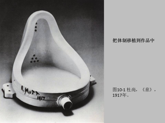 谈到前卫理论离不开这个“框子”,也就是反体制的观念。在这里面,早期叫做历史前卫,实际上就是老前卫, 20 世纪初的老前卫,像杜尚的《泉》把小便池放到美术馆,把体制移植到作品当中,以往的现代主义也会批评体制,但是没有像前卫艺术这样把体制的批判直接作为一种内容放到它的艺术作品中来的,这是比格尔在他的先锋理论当中的核心观点。