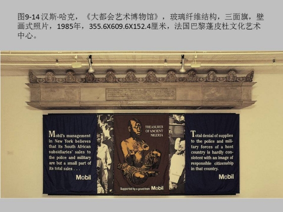 50 、 60 年代以后对体制的批判成为一种历史的主旋律,这是另外一个重要艺术家汉斯哈克的作品《大都会艺术博物馆》,把该美术馆的一个展览《古代尼日利亚的瑰宝》的招贴和这是美孚石油公司和南非政府签的条约,以及南非黑人抗议政府枪杀的抗议集会照片拼合在一起。美孚石油的条约说,我卖给你油,但是不允许你枪杀黑人,美孚石油公司是大都会博物馆的赞助商,这里面资助文化是冠冕堂皇的事,但是它又卖石油给南非政府,南非政府又枪杀黑人,通过这件作品就暴露出来美孚石油公司和大都会文化项目的虚伪性。