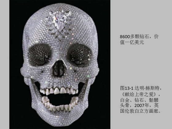 最后还有赫斯特,这是最走红的英国艺术家,用了 8600 多颗钻石,本身价值就 3000 万美元,最后售价一亿美元。艺术家直接和画廊发生关系作为它的商业代理,新前卫是和体制妥协。这件作品是艺术家给母亲生日的礼物,母亲说,如果让你拿出一件东西献给上帝,那是什么? 那么他就做了这个东西,它是非常崇高的礼品但是又是非常昂贵的商业品。