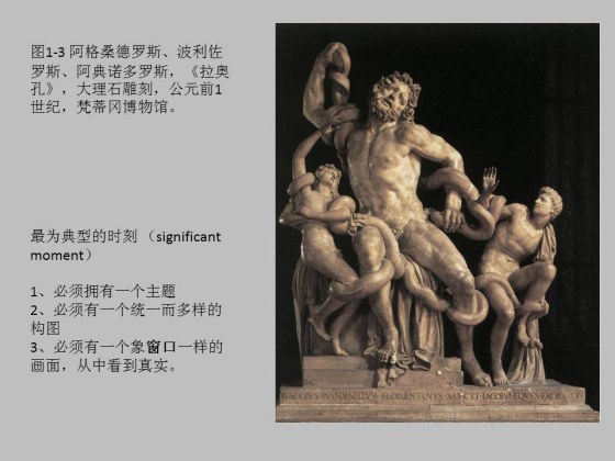 举几个例子。首先是大家很熟悉的《拉奥孔》,这是温克尔曼古代艺术研究中最主要的研究对象之一。而莱辛也专门写了一篇著名的比较诗和造型艺术的文字。在温克尔曼那里《拉奥孔》代表了典型的古希腊的时代风格,那就是“高贵的单纯、静穆的伟大”。但在莱辛那里,它是一种典型的空间时刻。