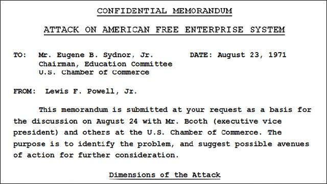 其中一个对我们当下造成了巨大影响的隐匿开端,发生在1971年,事件是“鲍威尔备忘录”。这份备忘录由刘易斯·鲍威尔撰写,早在多年前就已被某些人发掘了出来。鲍威尔当时是美国最受尊敬、影响力最大的企业法务律师之一,递交备忘录时,离他被提名至美国最高法院还有两个月。不过,时至今日,许多人仍旧会发现这样一项事实:正是鲍威尔备忘录,引发了一场商企界的暴乱,这场暴乱永久性地改变了华盛顿的权力格局,甚至对我们国家如今的政策和经济都造成了影响。