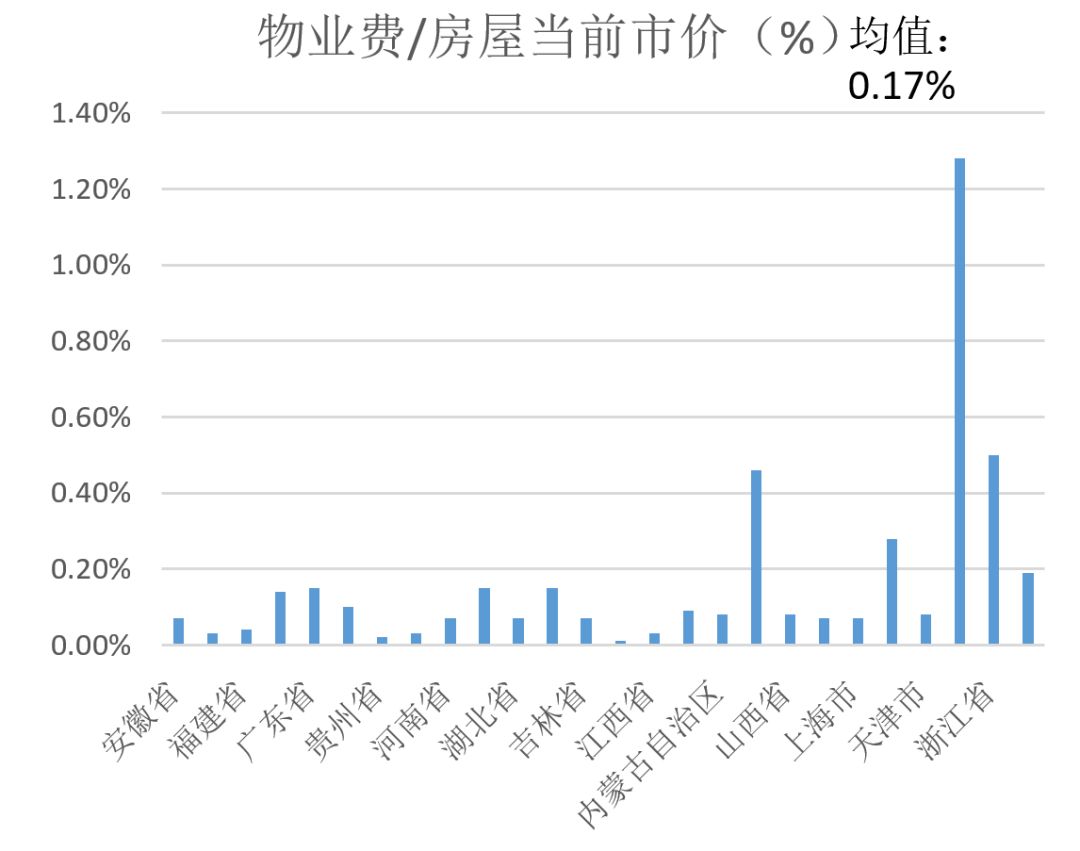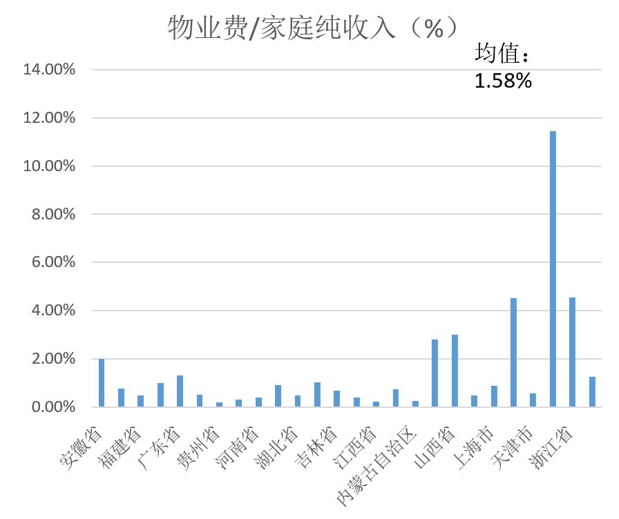 那么,物业费的情况如何?我们利用来自城镇家庭住户调查的数据来具体看下: 从算术平均值来看,目前物业费占家庭纯收入比重大概是1.5%,如果将房地产评估价值近似看作房屋当前的市值的话,物业费占房产当前市值大概是在0.17% ,这里可能因为有样本干扰的因素,所以有些省份的值会显得比较异常,但物业费大概是这么一个情况。