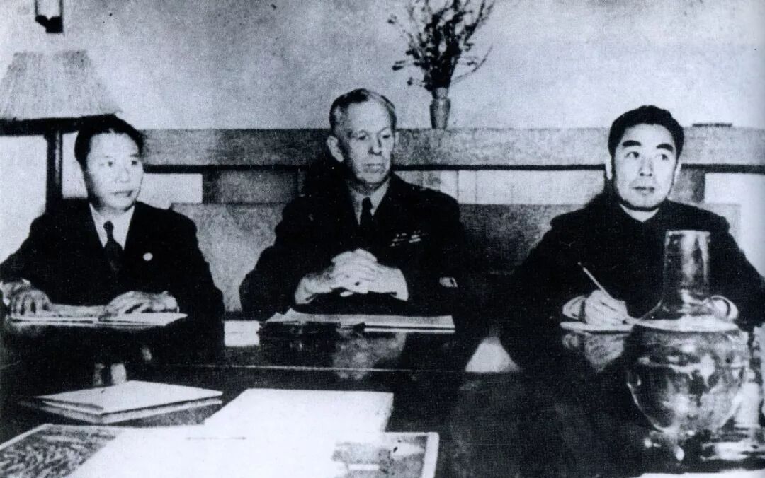 三人小组:国民政府代表张群,马歇尔,中共代表周恩来