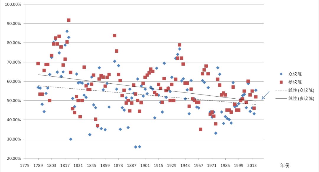 [⑥] 关于美国历届国会议席的党派分布,参议院情况见https://www.senate.gov/history/partydiv.htm;众议院情况见http://history.house.gov/Institution/Party-Divisions/Party-Divisions。