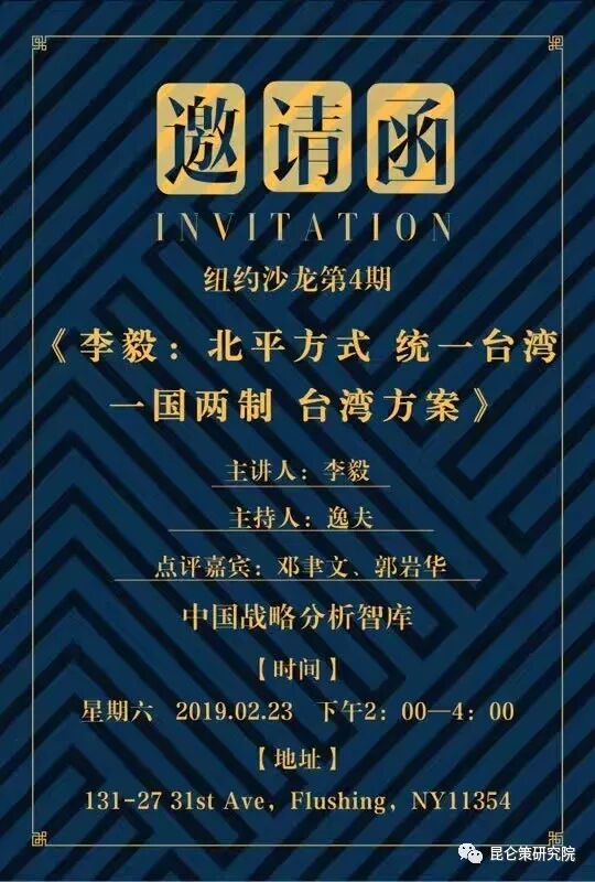 【编者按】本文李毅先生2019年2月23日在美国纽约法拉盛为中国战略分析智库所作的台湾问题演讲,题为 《李毅:北平方式 统一台湾 一国两制 台湾方案》, 现经作者授权首发。