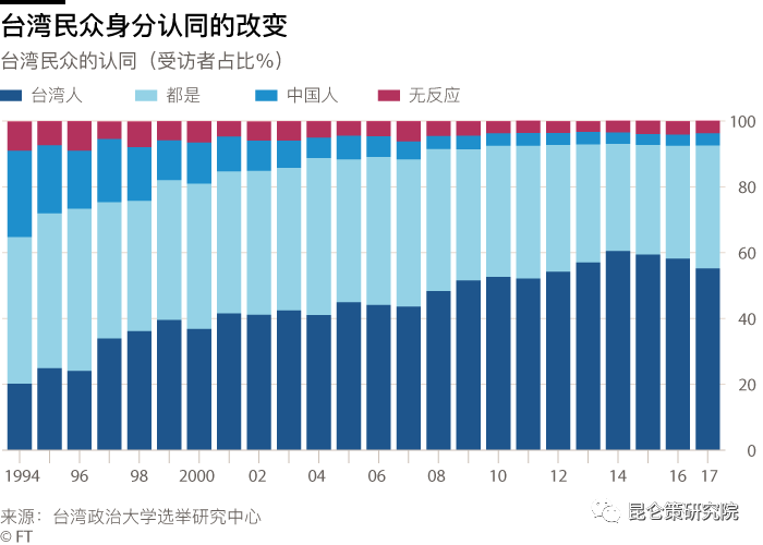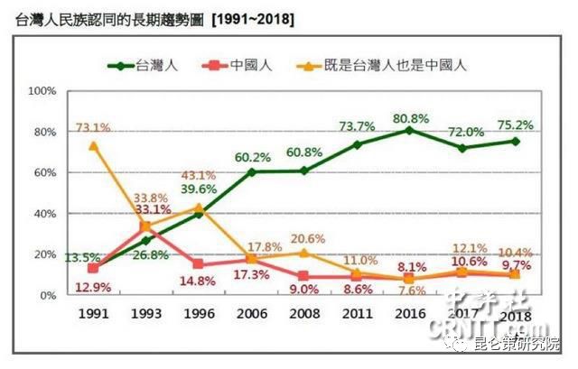 大体说来,从1991年到2018年,27年间,认为自己不是中国人的台湾人,从13%,增加到75%。同期,认为自己也是中国人的台湾人,从73%,下降到10.4%。同期,认为自己就是中国人的台湾人,大体保持在10%。2014年11月台湾九合一选举后,大陆几个重要媒体,纷纷刊发一篇著名文章,《张安乐:台湾已经没有中国人了》(见互联网),就是对台湾现状的精确描述。台湾现在有统一倾向的人,只有10%左右。主要是一些白发苍苍的老头、老太太。十年后,这些人,或者死了,或者走不动了。现在42岁以下天然独,十年之后52岁以下天然独,二十年之后62岁以下天然独。