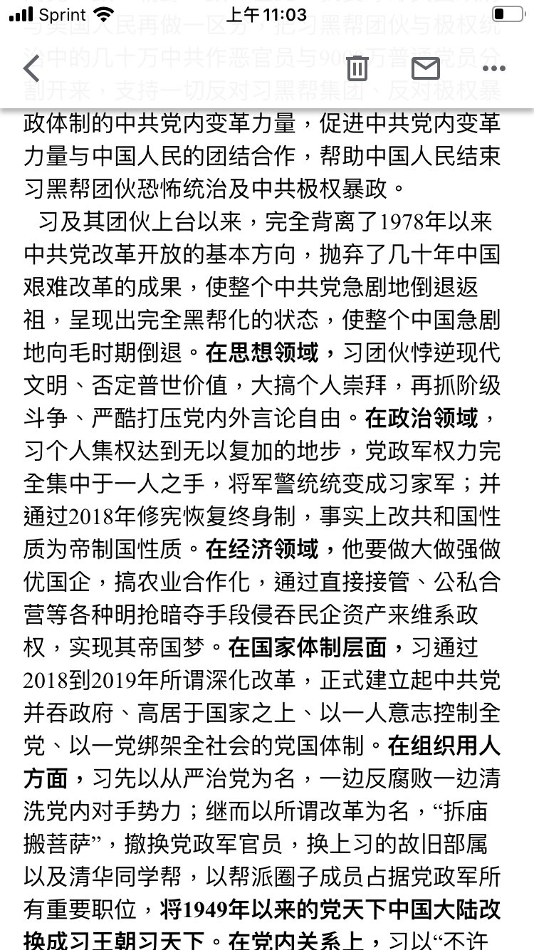 韩连潮: 【色厉内荏的五个不】习的五个“绝不答应”恰恰说明他惧怕这五个方面的真相,尤其是美国区分中共和中国人民的政策,让他绑架14亿人难以为继,其意识形态建立在谎言之上,在阳光下和民主理念对决绝无获胜机会;自由世界会逐项落实去习非共(delegitimize)措施,中国人民也绝不会答应世世代代沦为党奴。