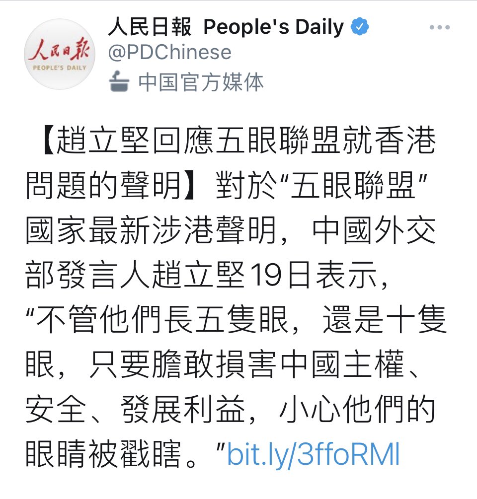 LT 視界: 針對「五眼聯盟」五國聯合聲明譴責中共逮捕前香港立法會委員,中共外交部發言人趙立堅稱要「小心眼睛被戳瞎」。即使不談立場,中共這種「戳瞎眼睛」的野蠻、殘忍的表達竟然是一個國家發言人脫口而出。可以想像,中共的政治文明與世界的距離。