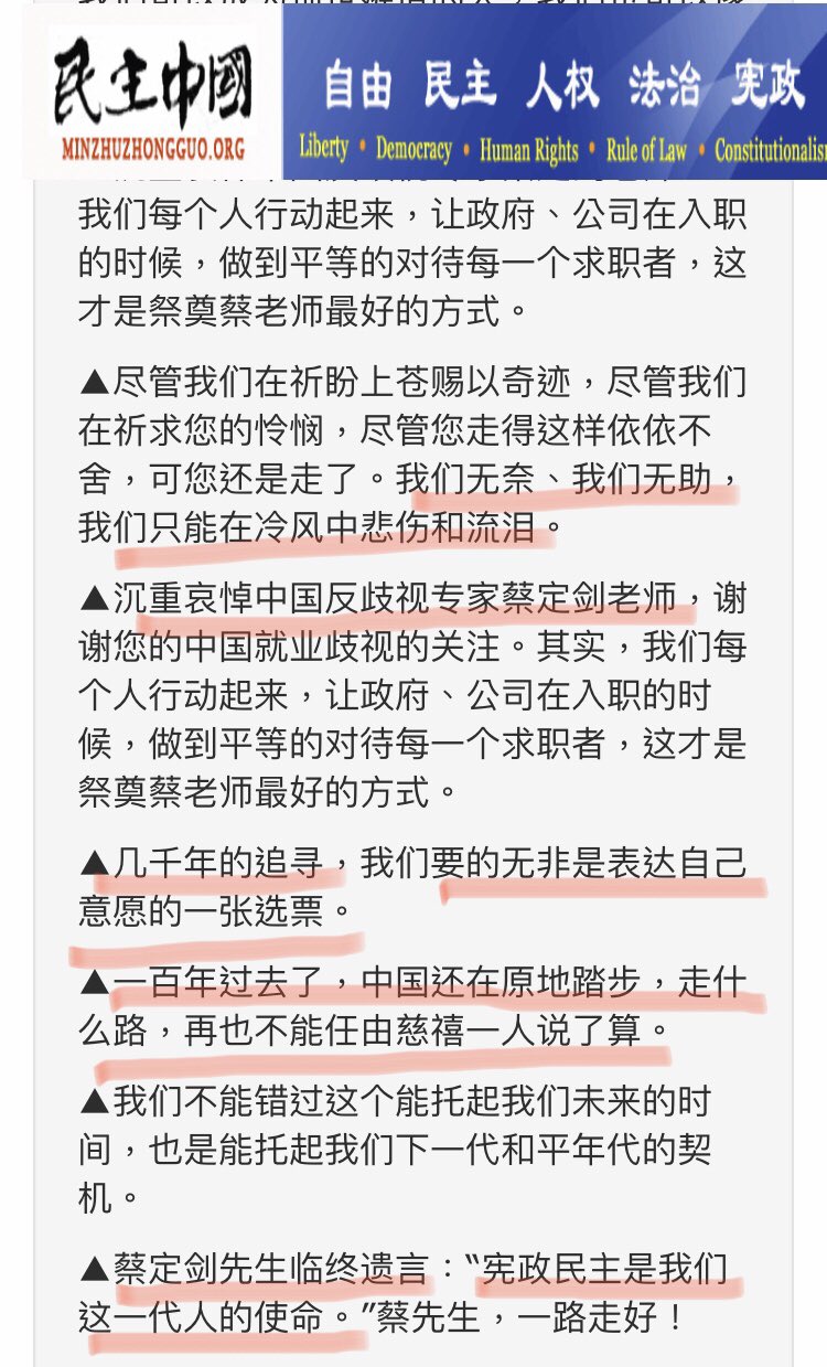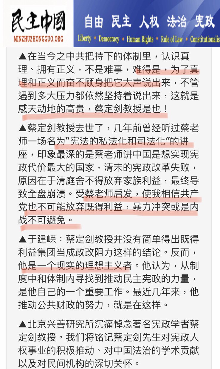 蔡定剑先生十周年忌日,大陆朋友发文给我,深深怀念定剑先生。十年来中国大陆的政治状况不仅仅是倒退,而且是走向反动。其突出标志就是2018年修宪取消国家主席任期制,事实上恢复帝制。定剑先生一生为之奋斗的实现中国宪政民主之事业,需要我们活着的人继续努力前行。