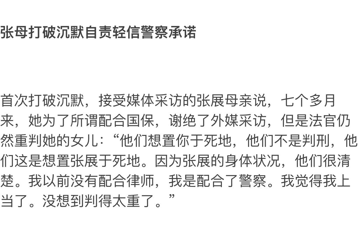 张展母亲的哭诉令人心碎令人警醒。习中共总是利用亲人还仅存的一点幻想,以为“配合当局,不对外说”能换来减轻暴政对正义人士的迫害。事实一再证明,这是习极权暴政对受迫害人士的亲人们实施的心理敲诈与行为控制。事实再次告诉人们:绝不配合当局,尽一切可能曝光暴政恶行,才真正有利于解救自己的亲人