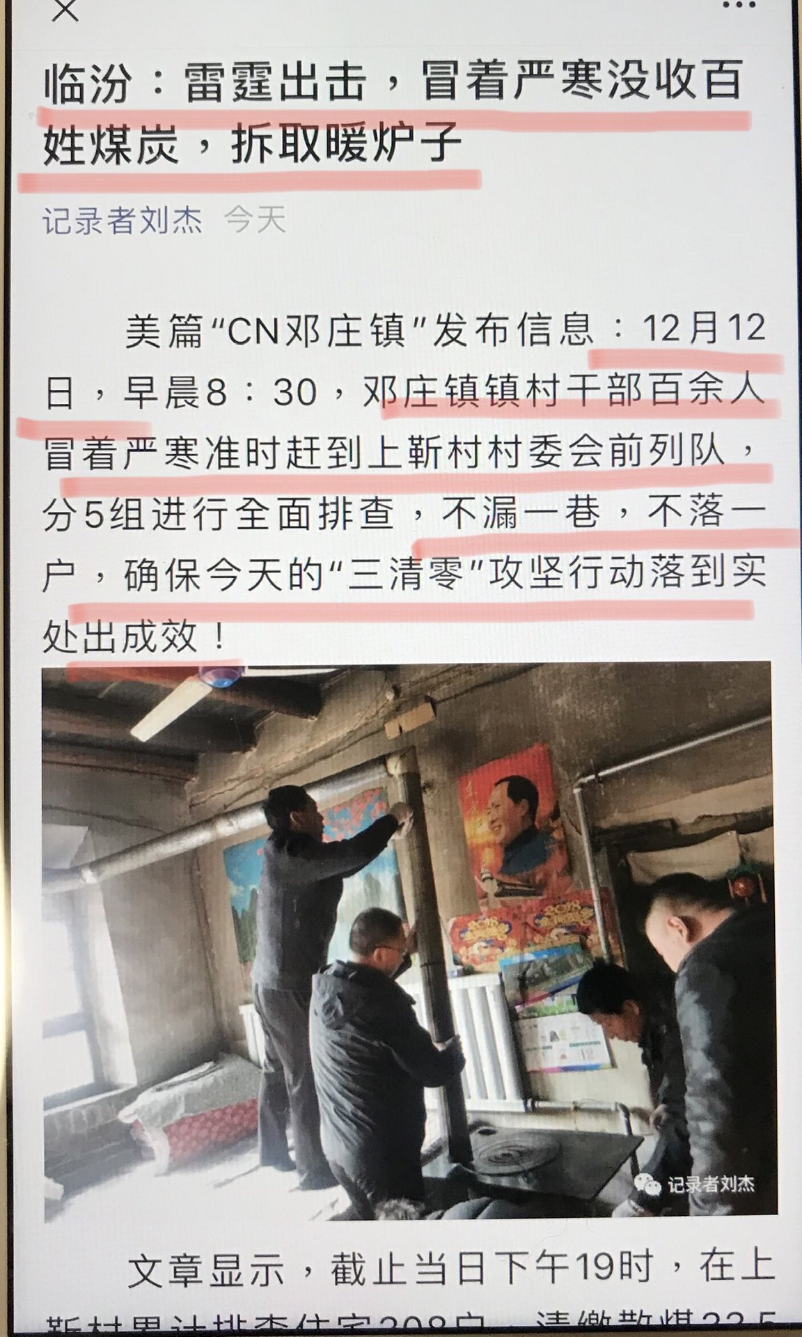 数九严冬居然以环保和人民健康为名,砸掉拆除民众烤火取暖过冬的火炉。毫无人性的政权大冬天强拆民房、强拆火炉,直接置民众于极度寒冷的严酷之中,令人发指!特地查了山西临汾的天气预报,最低温度低至零下14摄氏度,最高温度还不到零度。