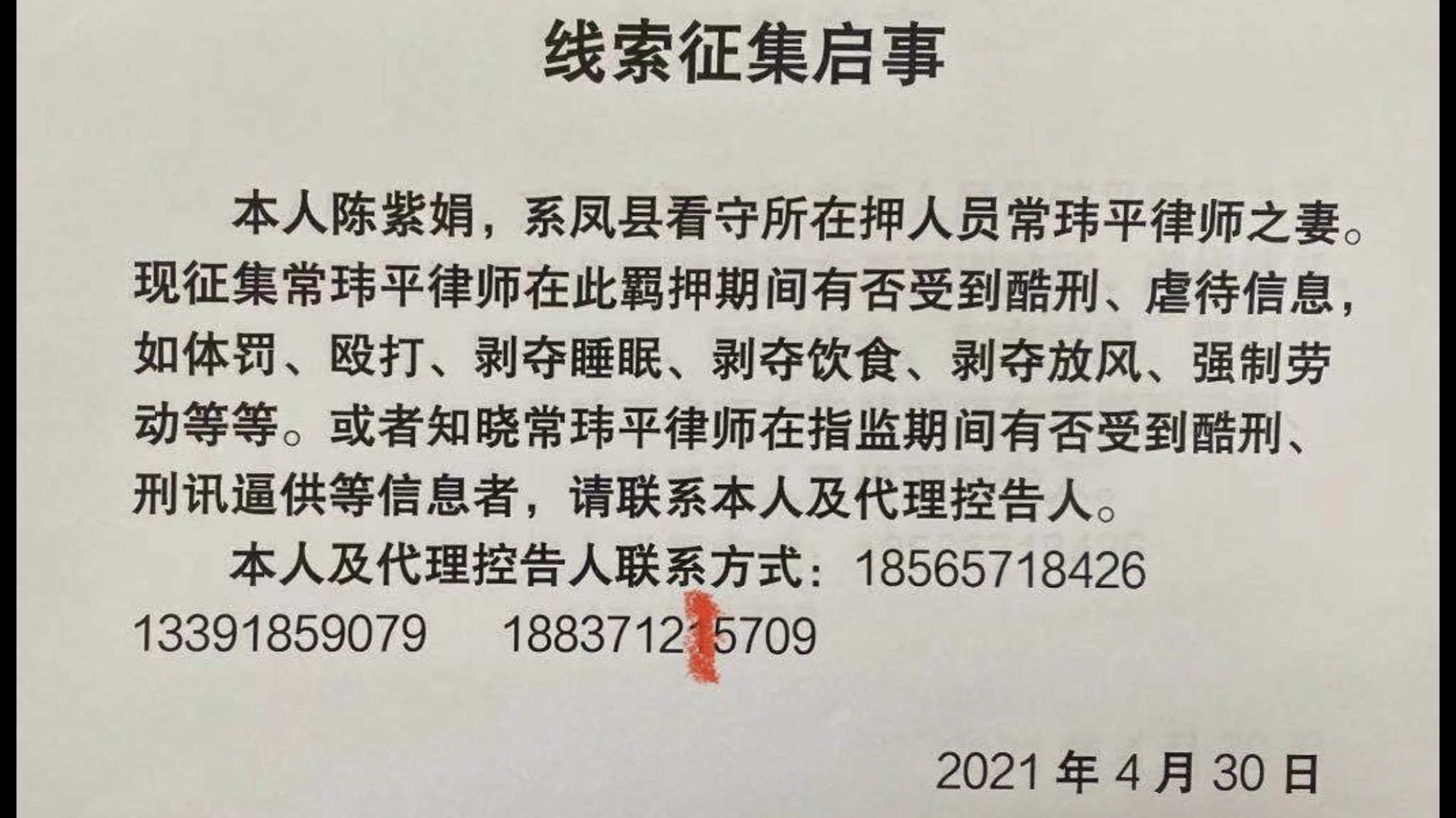 本人陈紫娟,系凤县看守所在押人员常玮平律师之妻。现征集常玮平律师在此羁押期间有否受到酷刑、虐待信息,