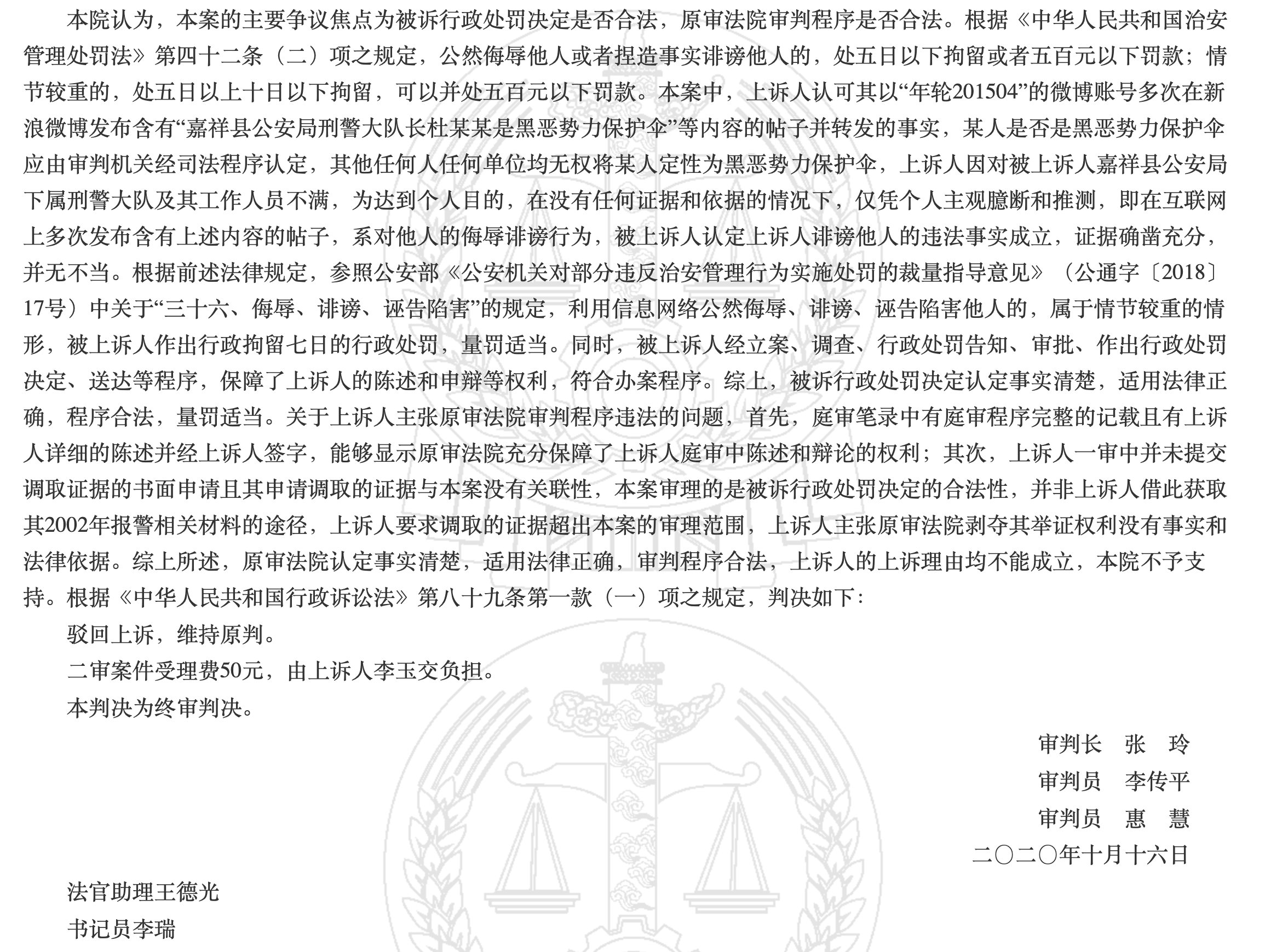 山东省嘉祥县男子李玉交,因在微博发帖指控当地刑警队大队队长包庇黑恶势力,并称其是“公安队武(伍)里的冠状病毒”和“比今年的病毒还可怕”,被处拘留7日。