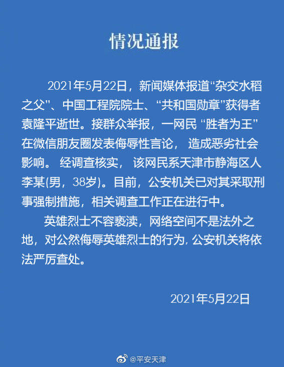 今日,“杂交水稻之父”袁隆平去世,天津男子李某在朋友圈转发袁隆平去世的新闻,并评论说“他终于死了……他改变了水稻的初心,让水稻成为了性奴,改变了水稻的纯洁“,被认定为侮辱袁隆平,并已被采取刑事强制措施。