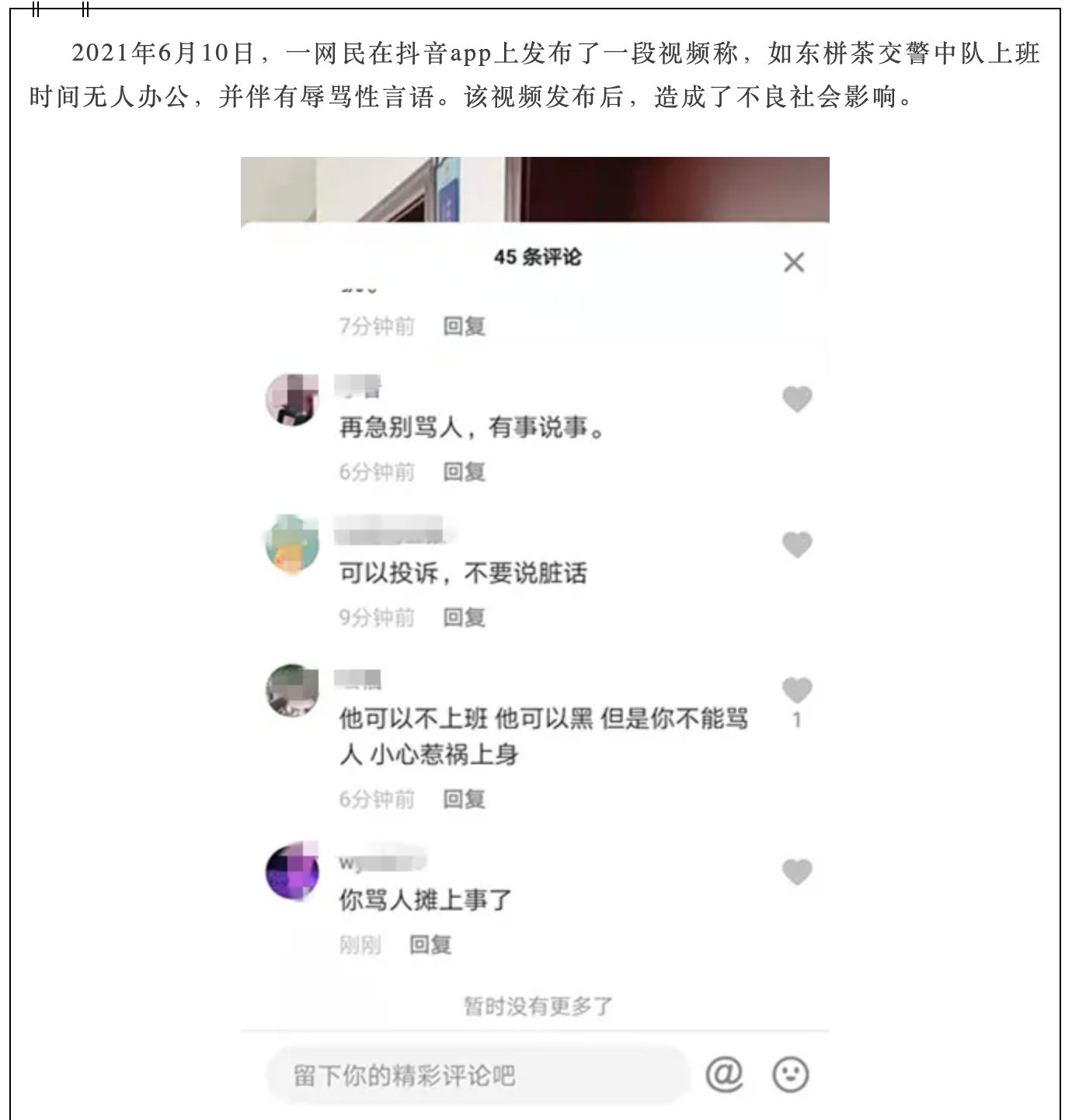Jiangsu man Miao, who found local traffic police team was not working during working hours, shot a video of the scene and posted it on Douyin, in which he verbally cursed local police, which made him detained for 3 days.