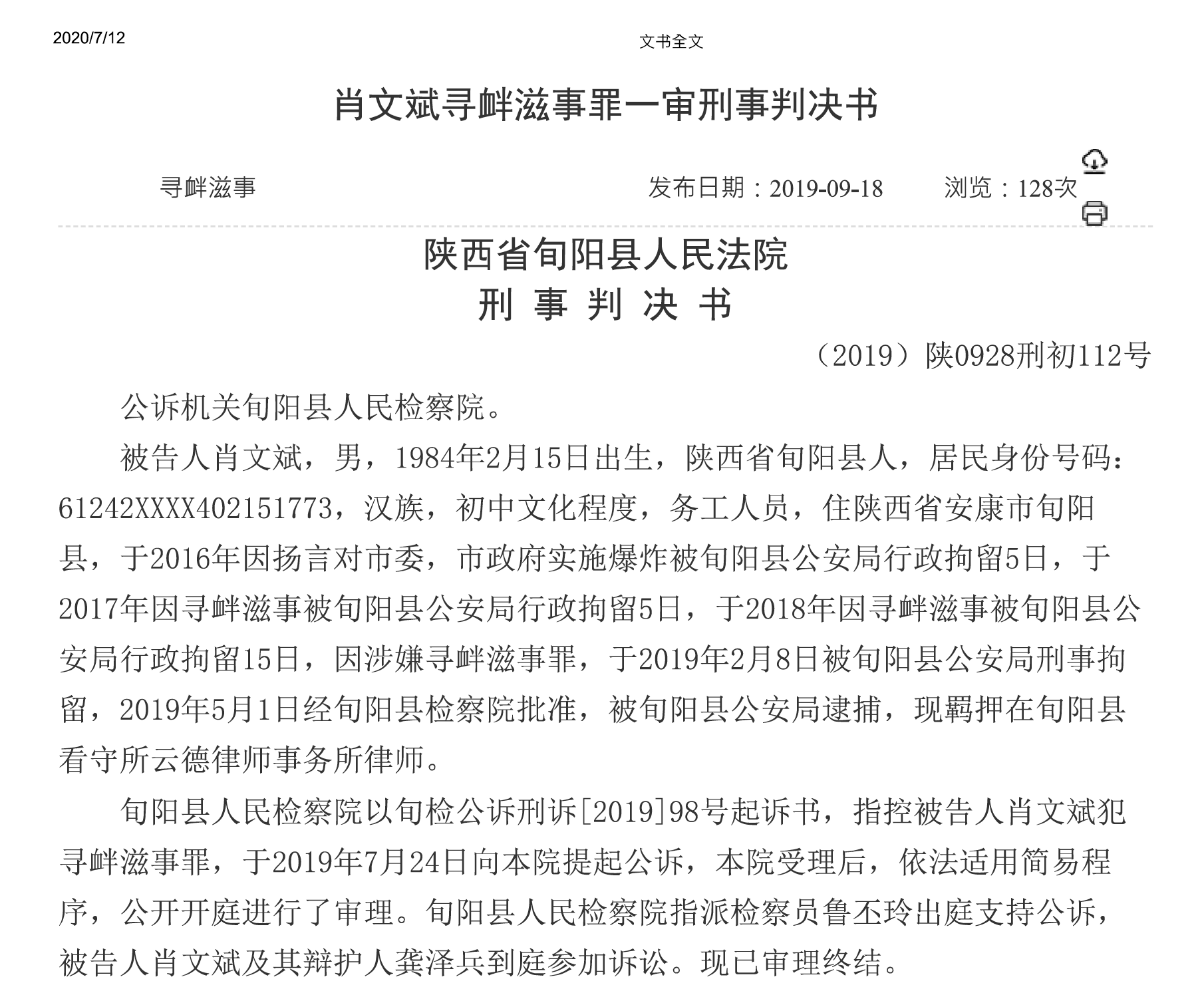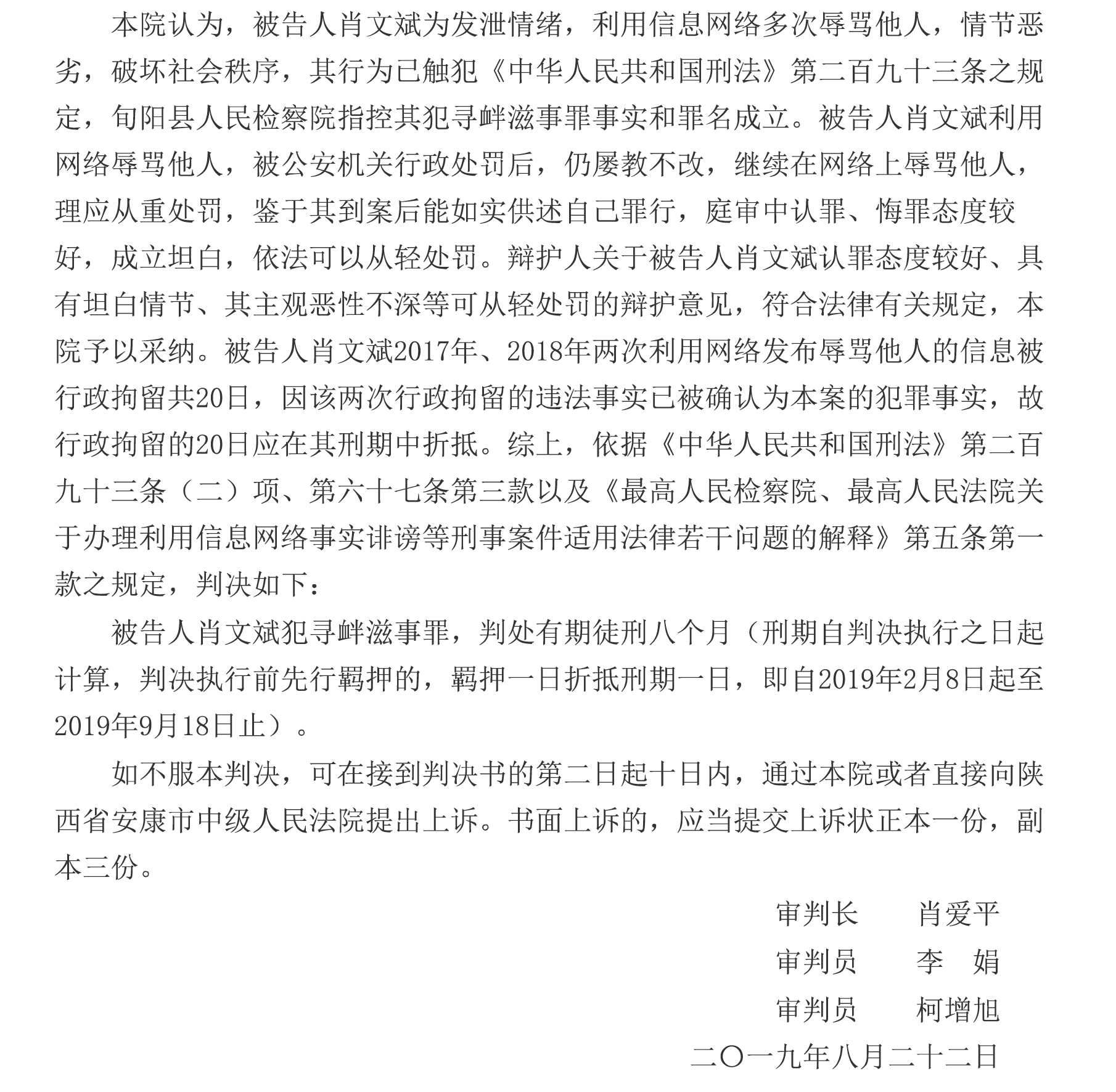 陕西省旬阳县男子肖文斌,因在县政府网站、国家信访局网站及微信等网络场合“辱骂“当地县级和市级政府官员以及共产党,被判处有期徒刑八个月。