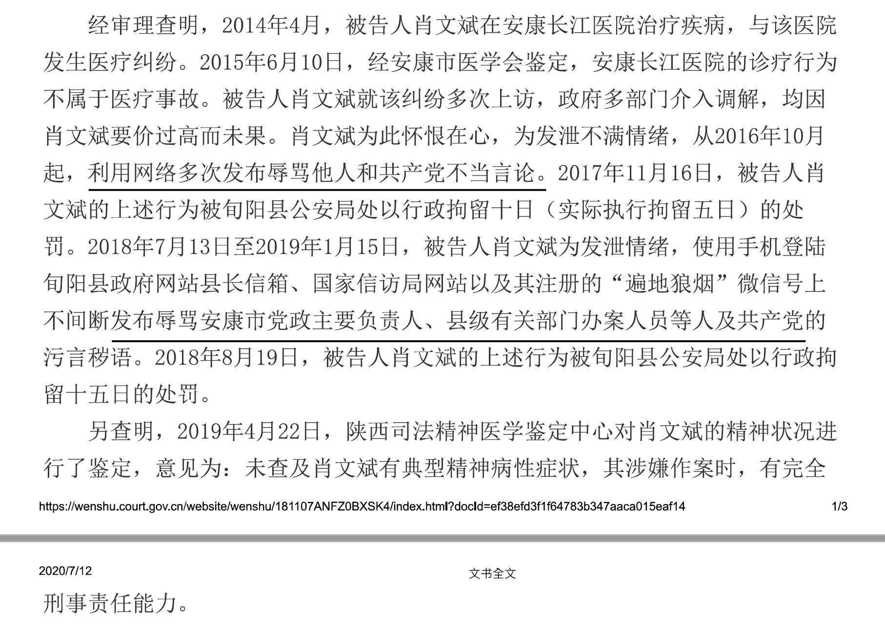 Shaanxi man Xiao Wenbin sentenced to 8 months in prison for posting remarks on government websites and WeChat that “insulted” local county and municipal government officials and the Communist Party.