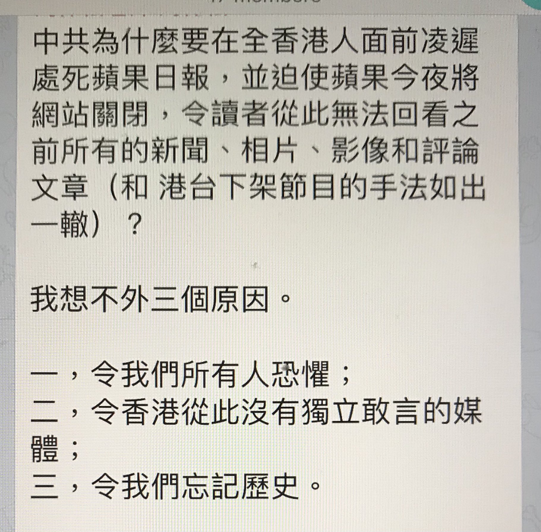 中共赤裸裸的新极权,比纳粹希特勒更凶狠更野蛮。全球热爱和平自由民主的人们与国家政府共同支持香港民众,声援苹果日报,就是捍卫自己的权利与尊严。更希望西方国家政府把政治声援态度转化为、落实为更多的国家政策行动。