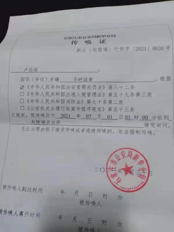 谢燕益: 卢廷阁律师七一因微信发言遭石家庄公安局新华分局传唤,截止到2021年7月1日夜10:18分电话无人接听一直未归,石家庄新华区赵陵铺派出所电话:0311—87754301,请大家关注,谢谢🙏🙏