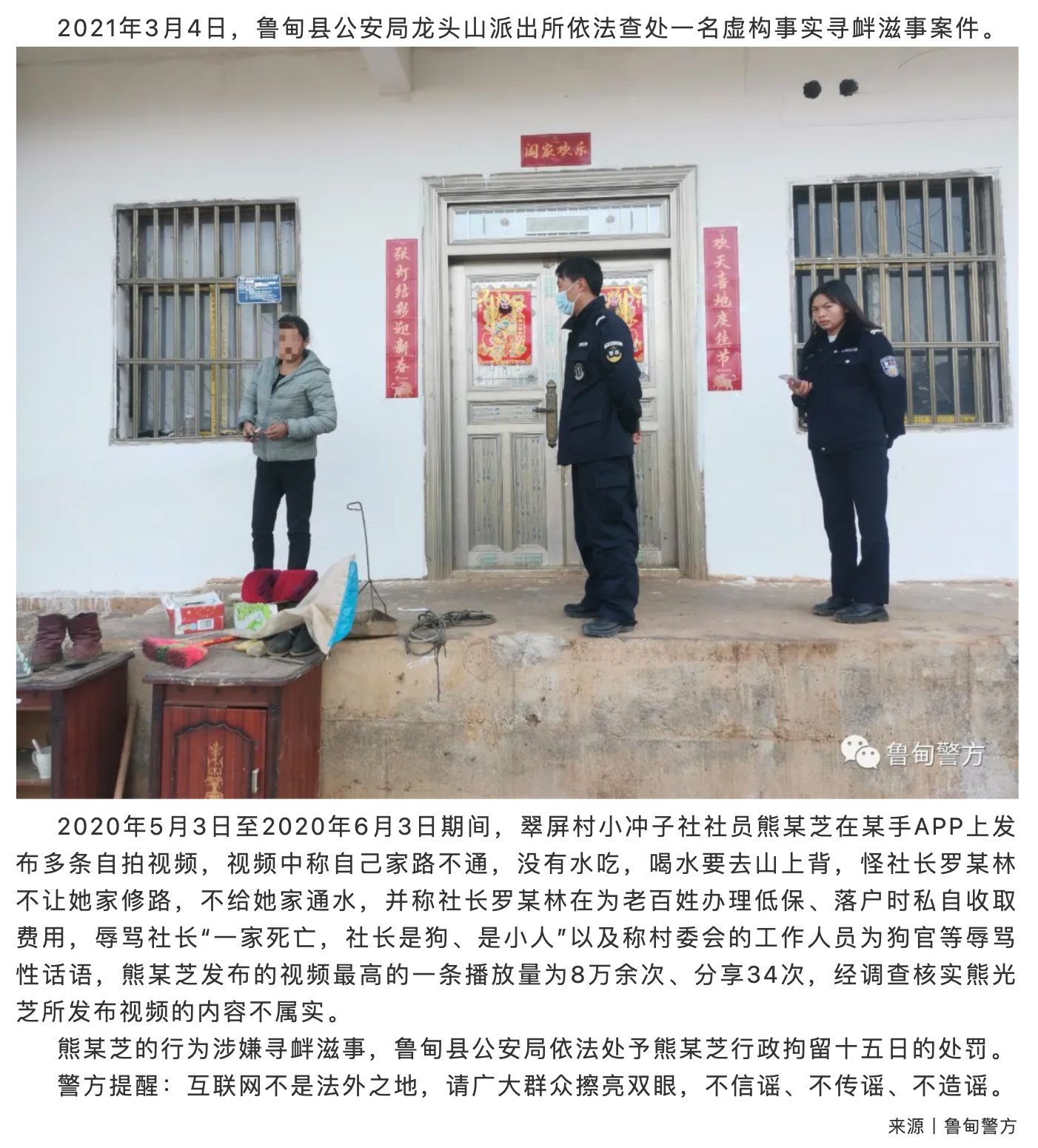 云南省鲁甸县女子熊某芝因在某手App上发布视频说社长不让她家修路,不给她家通水,并称其在为老百姓办理低保、落户时私自收取费用,还称该社长和村干部是狗官等,被处拘留15日。