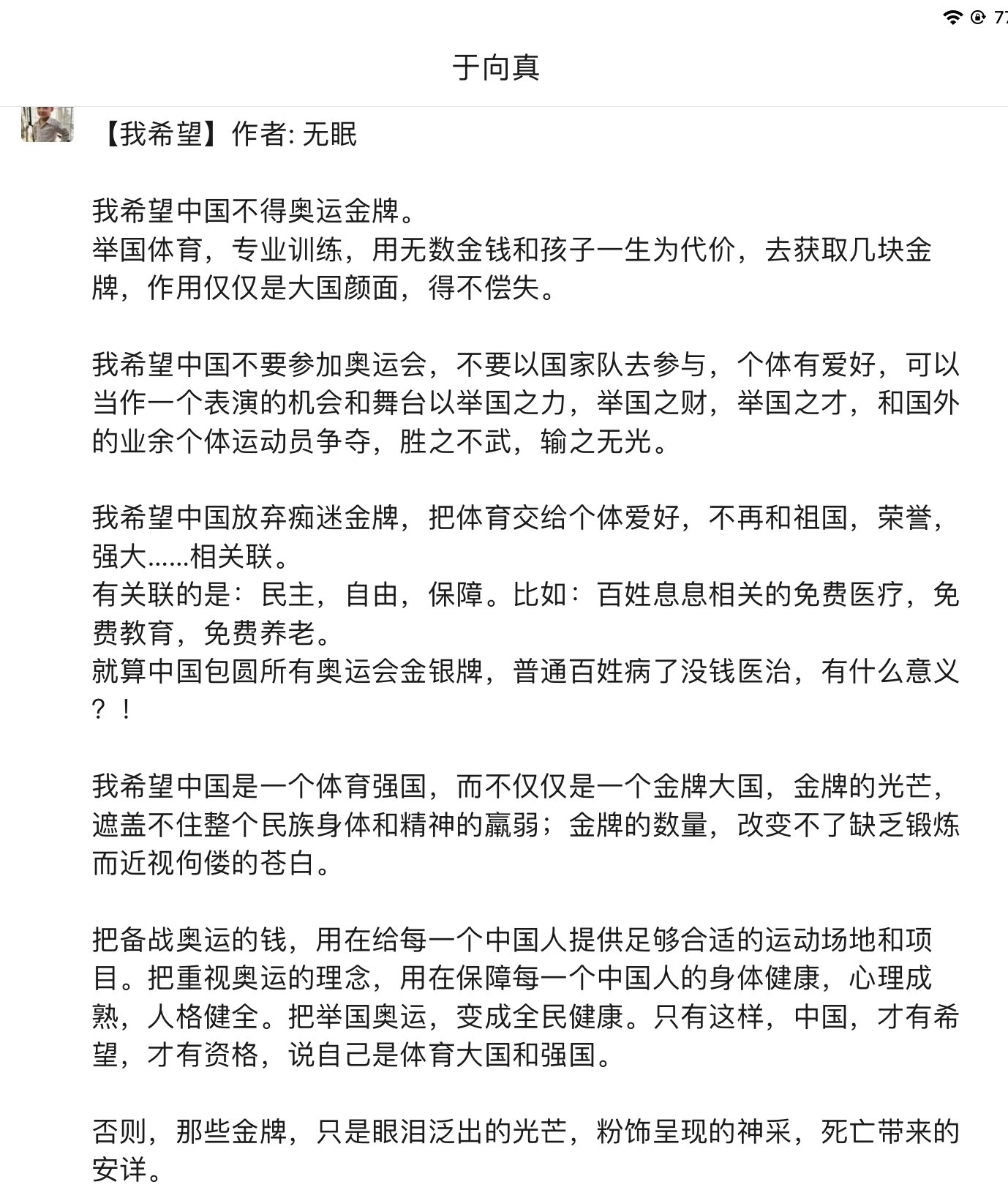写得好!真正的民众幸福不来自于以国家名义得金牌,而来自于每一个生活在大陆的人免于恐惧的自由,免于匮乏的自由,来自于有尊严的生活。