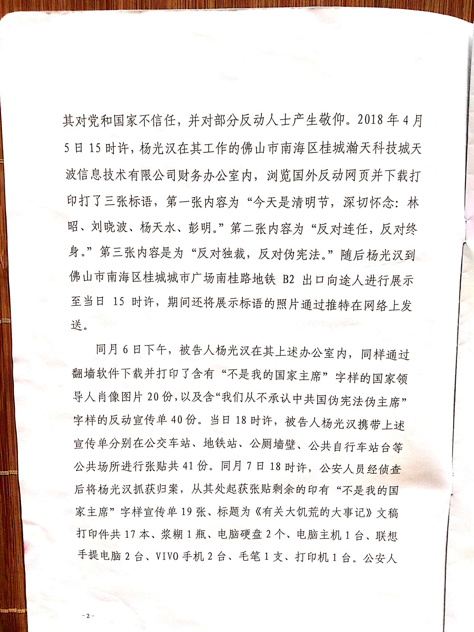 广东省佛山市异议人士杨光汉,因在公开场合举牌表达其政治观点和诉求,如怀念林昭和刘晓波等人、反对习近平终身制和反对中共独裁等,以及在多处张贴“不是我的国家主席”等反动标语,于2018年被判处有期徒刑半年,缓刑一年半。