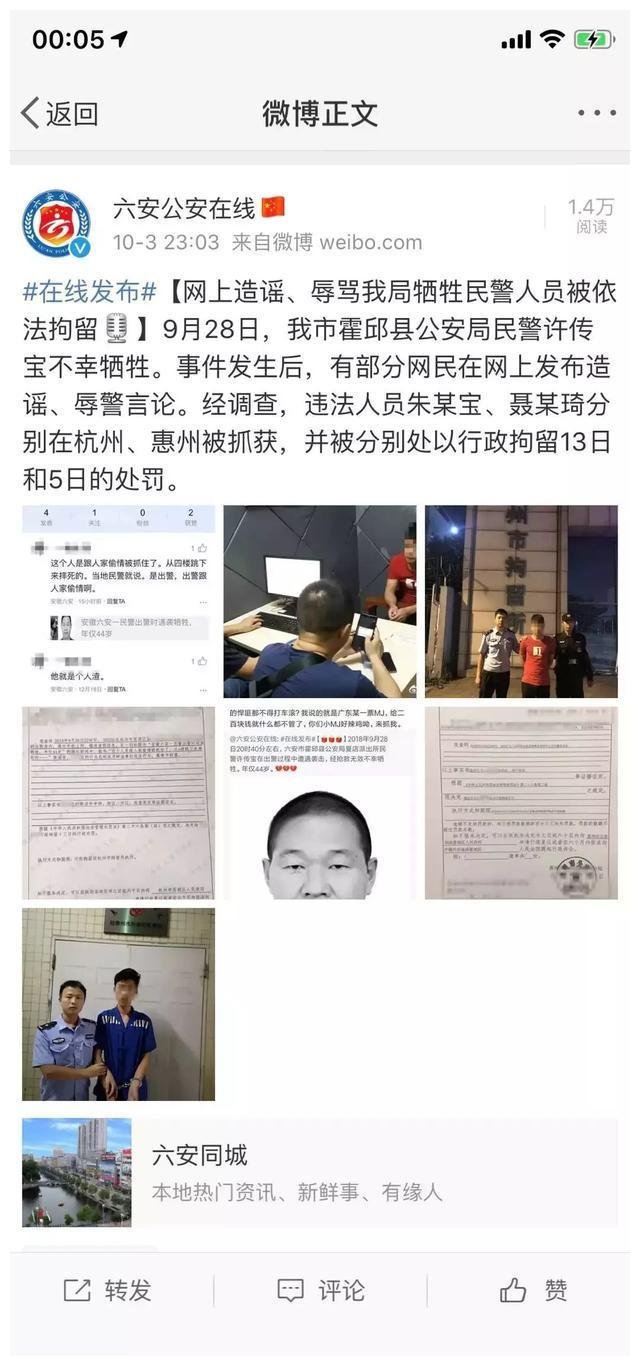 2018年10月,安徽六安市霍邱县警方通报一名警察“因公殉职”,随后,两名网友因为妄议此新闻,被跨省抓捕并行政拘留。居住在杭州的网友六安籍网友朱某宝因说该警是偷情时被抓跳楼而死,被处拘留13日;广东惠州网民聂某琪因评论此新闻时说广东的某票MJ(民警)是垃圾,被处拘留5日。