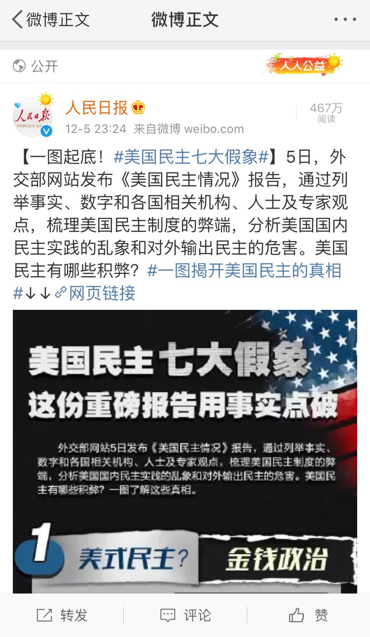 日常現象: 人民日报发微博称一图起底美国民主七大假象,网民评论大翻车。