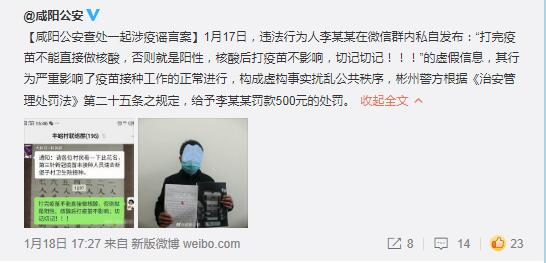 陕西咸阳男子李某,因在微信群内散布“谣言”称“打完疫苗不能立刻做核酸,否则就是阳性”,被当地警方罚款500元,警方称其“谣言”严重影响了疫苗接种工作。然而,广东疾控发布消息称,打完疫苗立刻做核酸确实可能导致检测出假阳性。事件引发议论后,咸阳警方已经删除了该案件通告,不确定是否已撤销处罚。