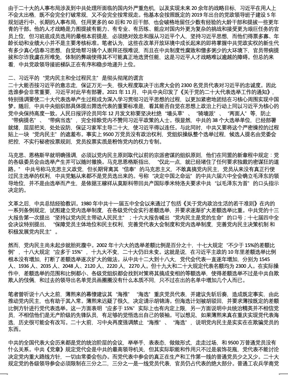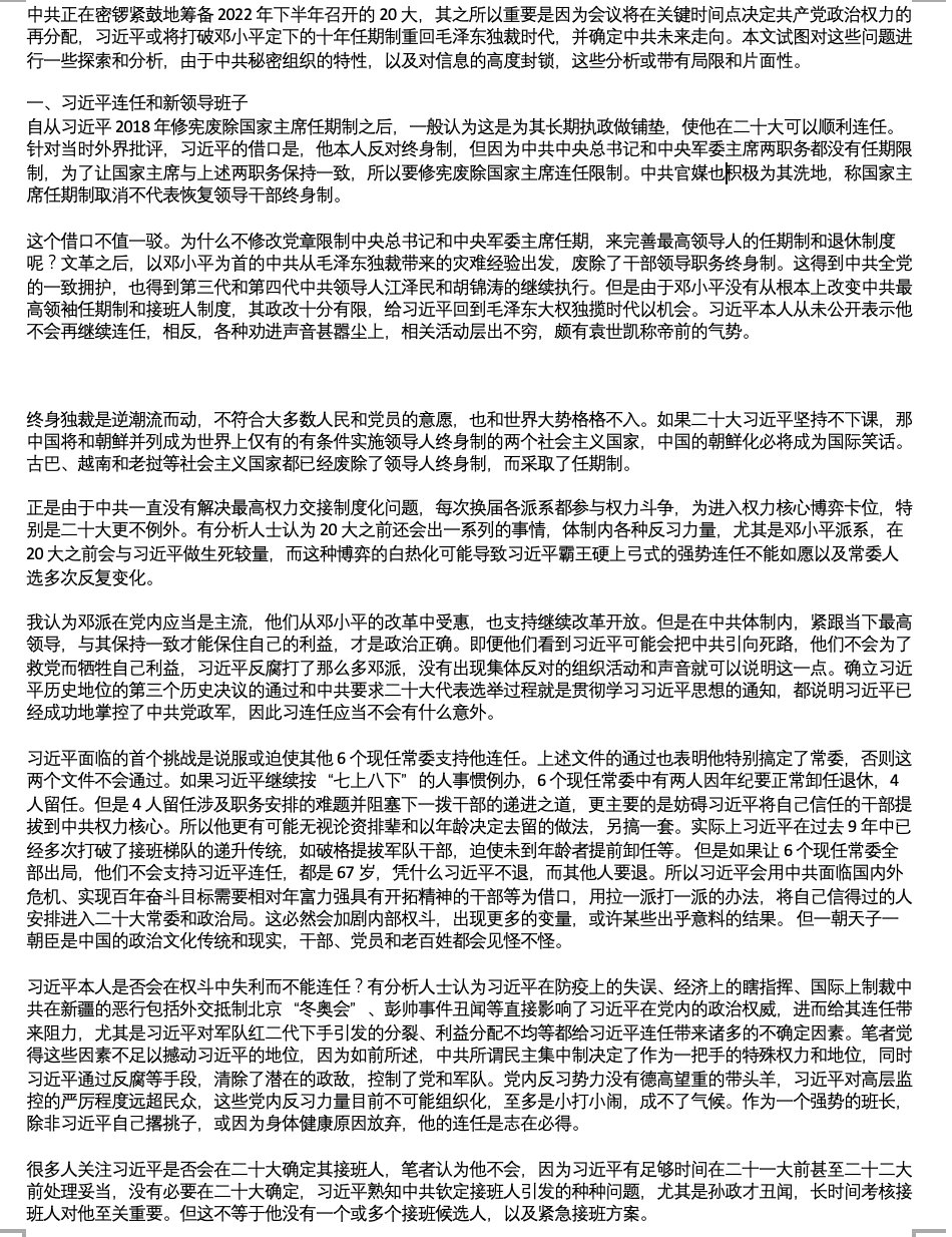 虽然我不同意这篇文章中认为习连任不会有意外的判断。我的看法是“一切皆有可能”,二十大前中共国充满变数。