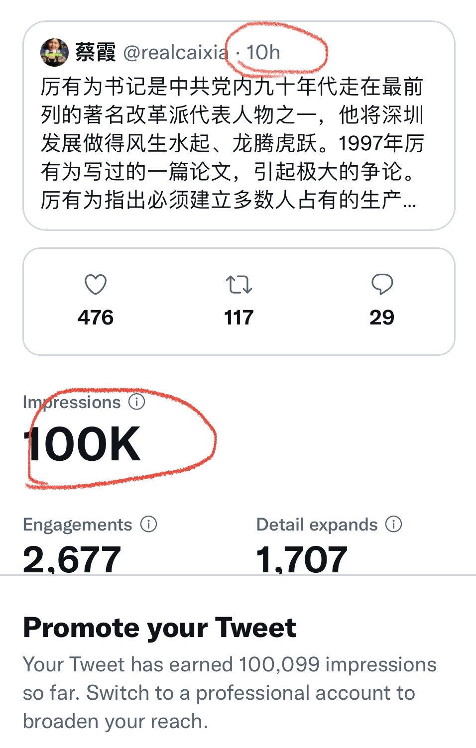 凡不是《议报》组稿,不涉及到习连任的推特文:均以“k”为计量单位,都在10万以上!