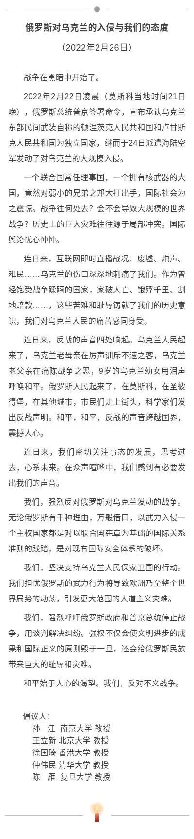 China is even censoring anti-war speeches now. Five professors from different universities in China issued a joint statement to denounce #Russia invasion of #Ukraine on WeChat platform, and the article got shortly blocked due to “violation of regulations”.