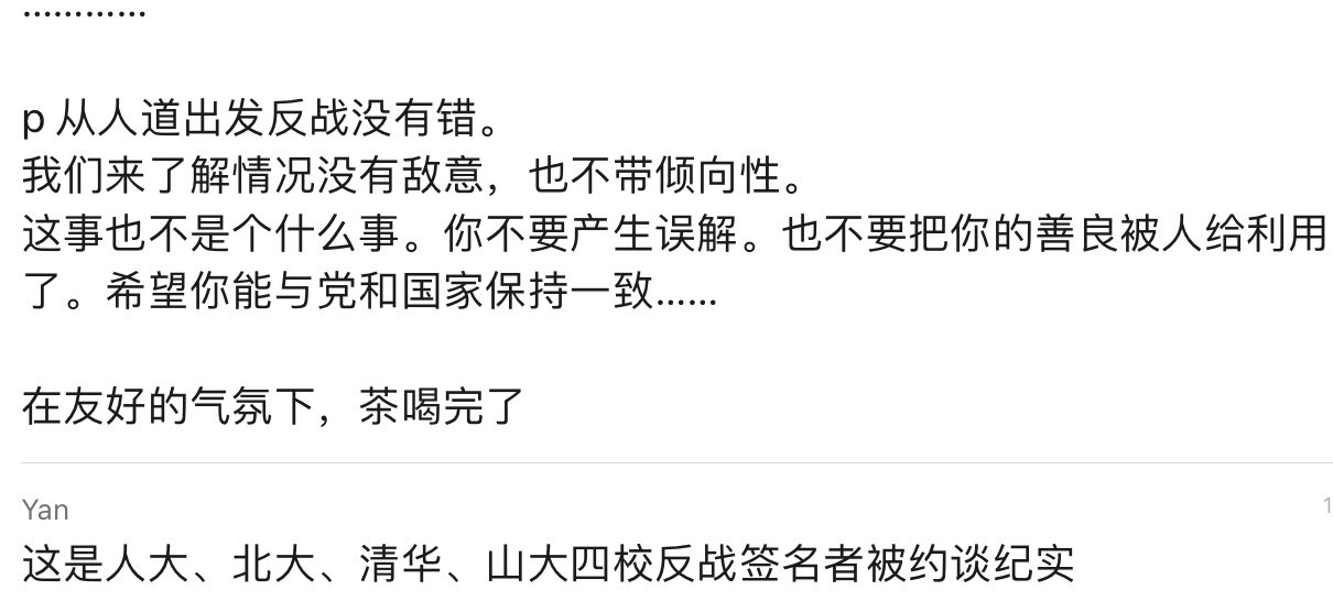 鲁 难: 反战声明有反应了,警察约喝茶就是其中一种。不过,我们做的是正确的事,合情合理合法合规,校友们并不惧怕。我不希望参加联署活动的校友陷于困境中,目前为止我们做到了。警察在下图中简称P,没有找到、也说不出来我们行使宪法赋予的言论自由,有什么不对的地方。